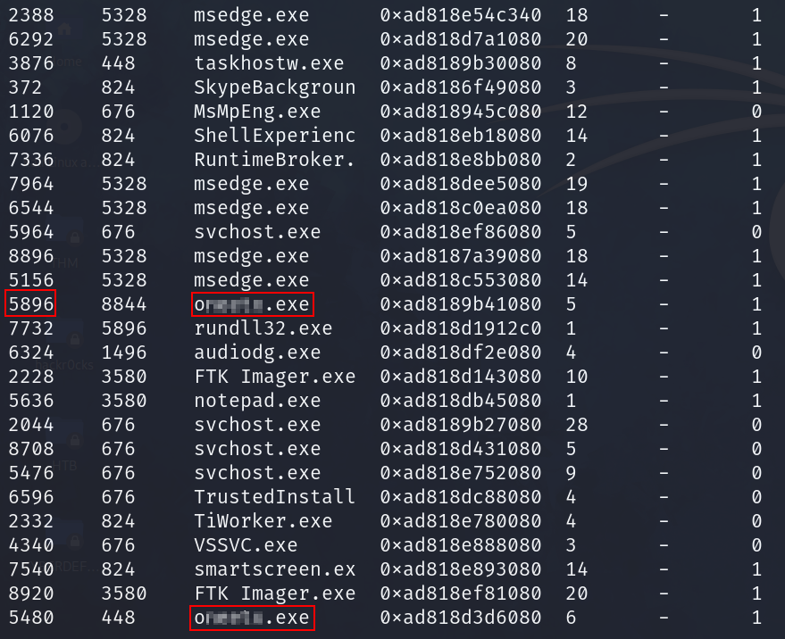 Listando los procesos existentes en el volcado de memoria se puede ver el proceso sospechoso on****.exe corriendo con el PID 5896.