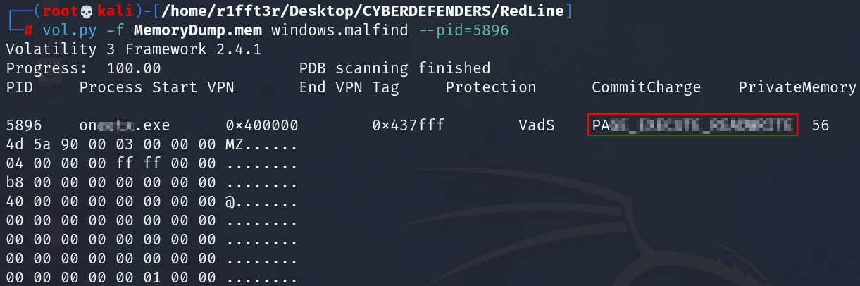 vol.py -f MemoryDump.mem windows.malfind --pid=5896