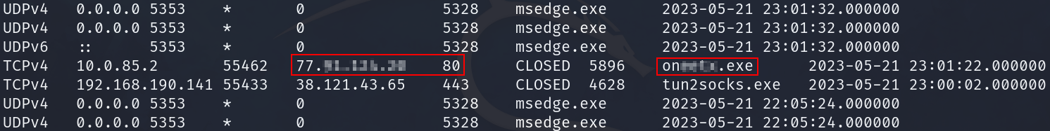 Listando las conexiones abiertas en la máquina podemos ver que on****.exe realizó una conexión TCP hacia la IP 77.**.***.** por el puerto 80, en la fecha 21/05/2023 a las 23:01:22 hrs.