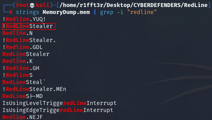 Usando el propio nombre del reto como pista, si buscamos por strings en la memoria, nos encontramos con el nombre de la familia de malware Redline Stealer.