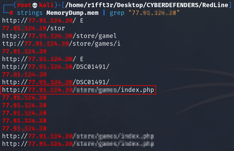 Buscando por la dirección IP del atacante como string dentro del volcado de memoria, podemos ver que ingresó a la URL http://77.**.***.**/*****/*****/index.php